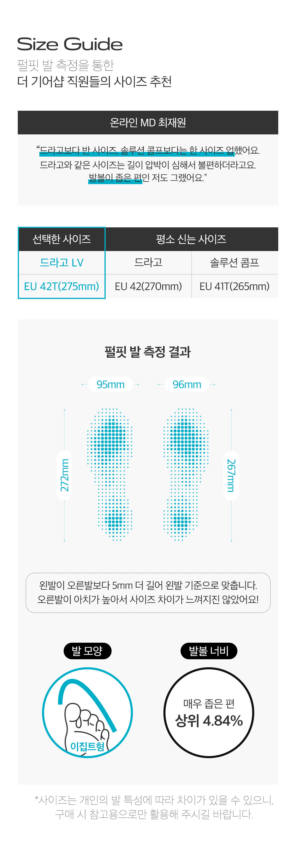 엄지발가락 쪽이 가장 길게 뻗은 형태의 발 모양에 적합합니다.