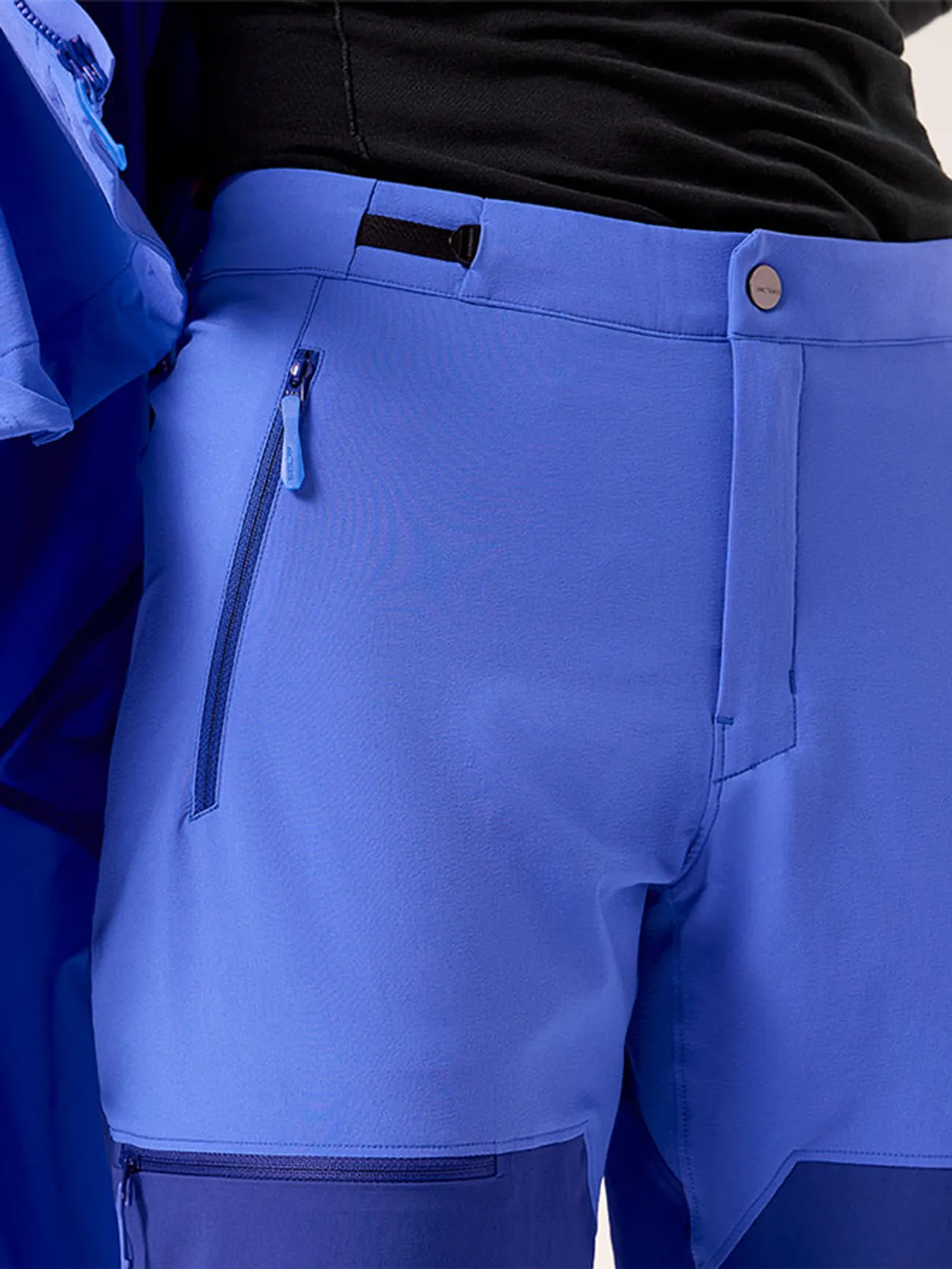 · 메시 안감이 있는 지퍼형 손 포켓 두 개, 하네스 착용 시 사용이 가능한 지퍼형 허벅지 포켓